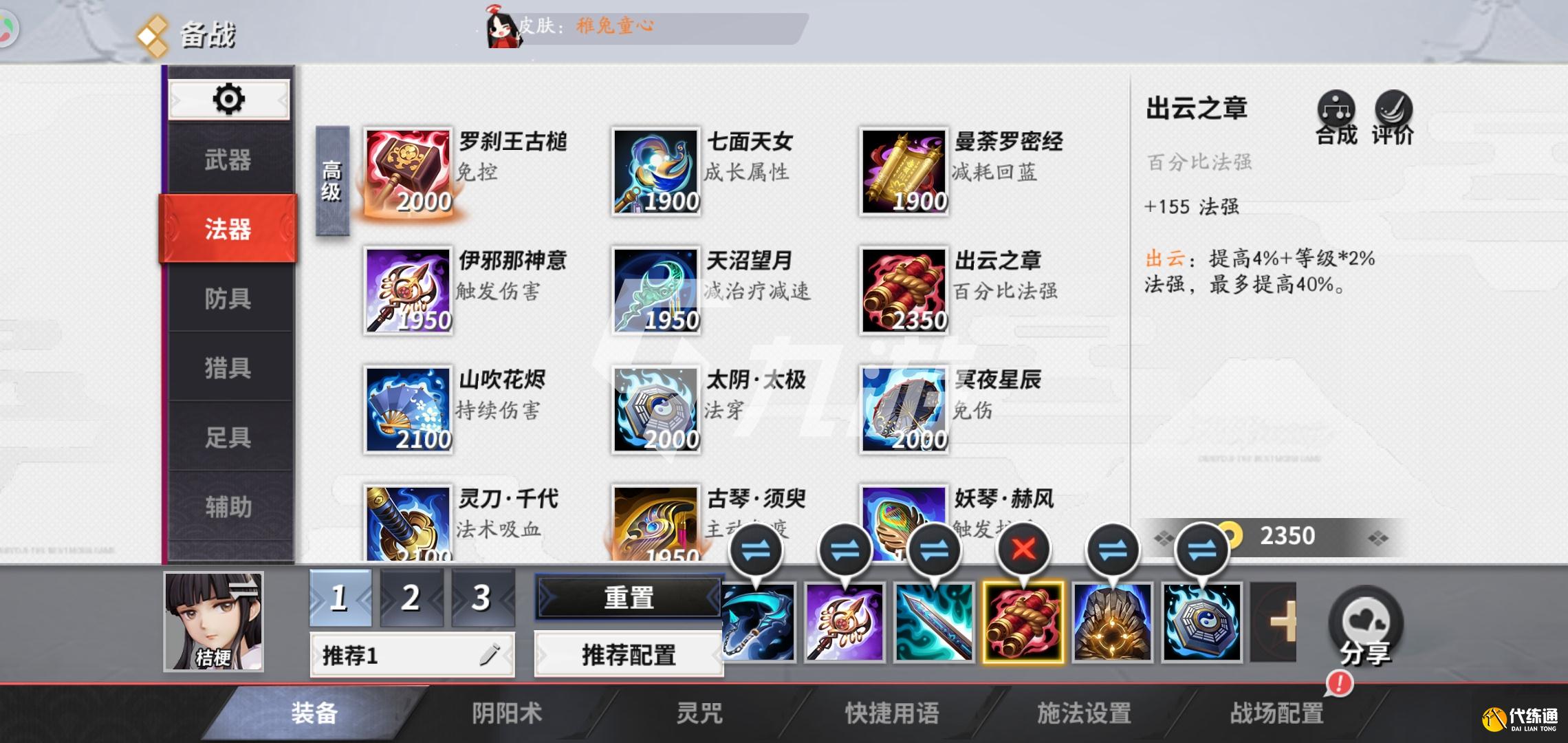 第三件装备我们就出出云之章了,这件装备专门给我们增加法术强度,而且还是一件成长型的装备和桔梗的成长型技能是十分的契合的,越到后期时候技能桔梗就会越厉害,而且出这件装备可以最快的在前期强化我们的一技能,一技能的强化效果主要依赖于法强的增加,在法强增带200的时候可以大大的降低一技能的前摇时间,而且在这个技能命中敌人后还会减少冷却时间。