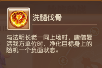 唐僧:与法明长老一同上场时,唐僧复活我方单位时,净化目标身上的随机一个负面状态。