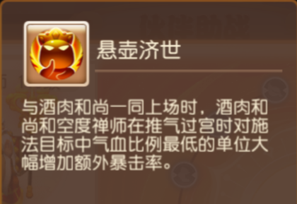 空度禅师:与酒肉和尚一同上场时,酒肉和尚和空度禅师在推气过宫时对施法目标中气血比例最低的单位大幅增加额外暴击率。