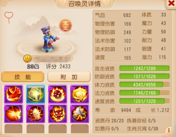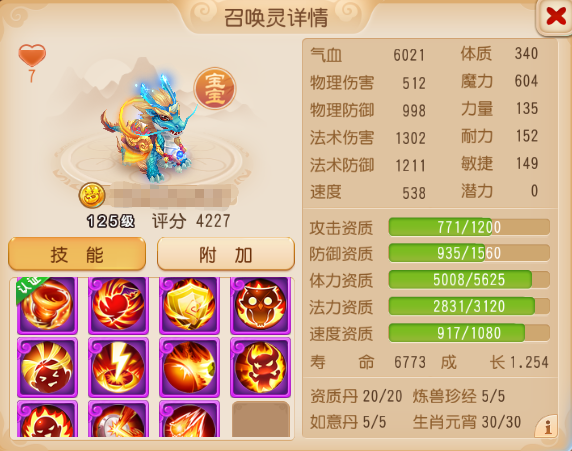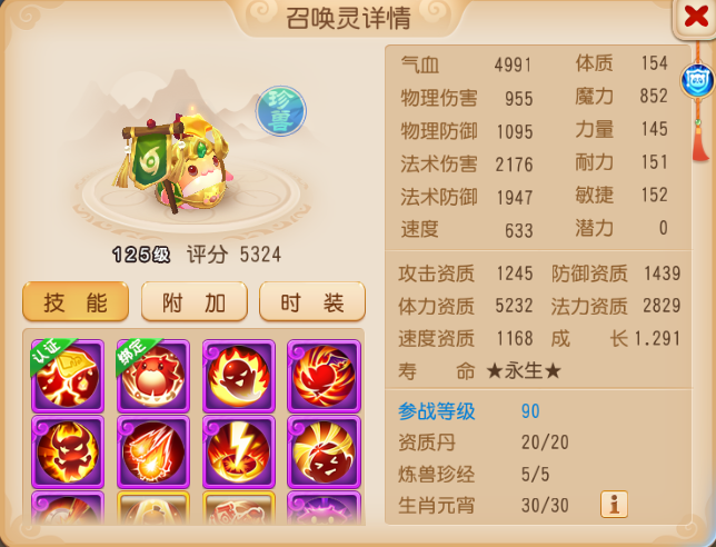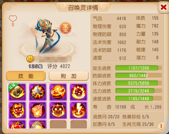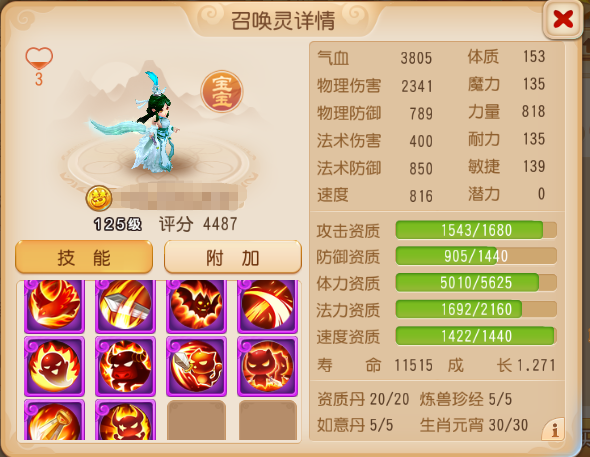 这只认证10技能的苏摩罗也是难以多得的法宠。5375的体力资质和2719的法力资质让苏摩罗的伤害和气血都说得上是优秀。