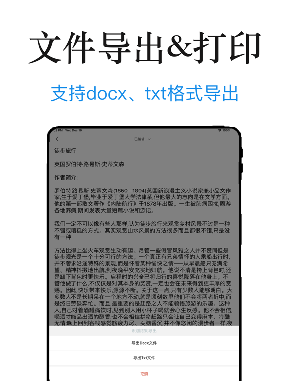图片转文字是一款对图片进行高精准的ocr文字识别的免费的扫描工具。 图片转文字集成以下功能: — 识别语言支持中/英,英文,日语,韩语,俄语,意大利,以及手写文字等多种语种识别。 — 它能便捷高效对图片进行批量拍照识别,支持识别结果进行pdf,docx,txt文档导出。 — 对文件高清扫描,智能滤镜,精准裁边,支持一键导出,打印。 — 扫描证件,添加水印,生活办公的好帮手。 — 图片高度还原excel,支持xlsx文件导出。 — 对识别结果能自由的通过涂鸦选中需要查看的文字区域。 — 扫描结果实时保存,方便小伙伴们查看结果,也可以看到是一款小型的文件存储软件。 还有更多功能需要小伙伴们去发现哦….. 希望小伙伴们能喜欢这款软件。优化app细节,app更简洁好用。