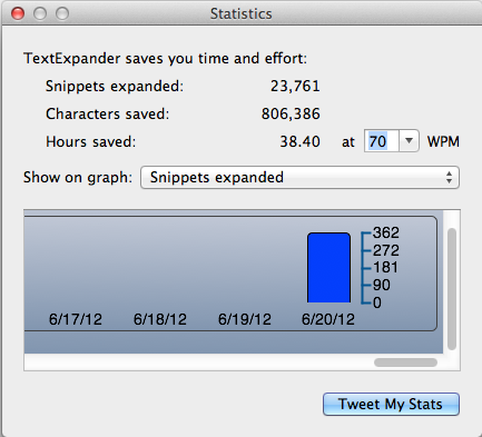 这款软件可以帮助您更有效率和更准确的进行文字输入,如果你经常输入一些相同的文字内容,那么你绝对需要这款软件。它可以记住你经常重复输入的文字,使用简短文字来替代更多的文字、常用短句、邮箱地址、帐号、网络地址、HTML 语法甚至是图片等,对于日常使用频率颇高的内容,该工具是不可得多的效率化工具,如果把它用好,你的工作效率一定会有一个质的飞跃。TextExpander支持Shell Script,AppleScript这两种脚本环境。 有了Shell支持,很多命令行下面的工具都可以用了,Shell下常用脚本语言Python、Perl、Ruby等语言更是强力支持。