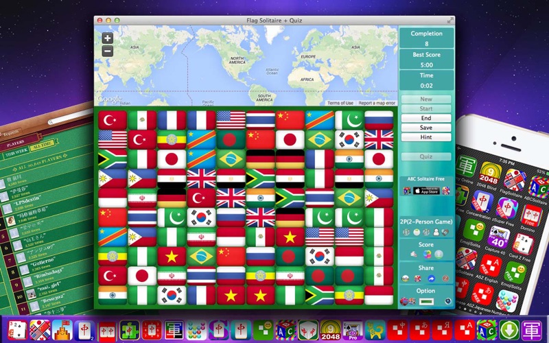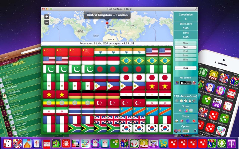 http://www.youtube.com/watch?v=w7Tmu29rbic (概述) 你有两种方式来玩此游戏:玩通关游戏或者回答小测验。但是两者不是孤立的, 你玩通关玩得越多, 你会在小测验中回答得更好。, (国家/地区的数量) 游戏共有175个国家/地区,按人口多少分为七组,每组25个国家/地区。 (玩通关) 玩通关游戏需要你的观察力和耐心。你要每次消除两面相同的旗帜, 直到所有的旗帜被消除。如果两面旗帜水平或垂直排列, 并且之间没有其他旗帜, 那么它们就可消除。为使旗帜可消除, 你可以最多移动一次旗帜。你的任务是找出潜在的可消除的旗帜。这是考验你的观察力和耐心的地方。你只有一次寻求提示的机会。, (回答小测验) 你要在90秒内回答25题。问题将从第1组到你刚玩过的一组中随机挑选。第1组的问题是最容易的, 每个正确答案得一分。组号越高, 得分越高。问题形式有两种类型:给你旗帜, 你回答其国家/地区名称;或者相反。连续正确的回答将得到高分。, (国家/地区的概况) 当你点击一面旗帜时, 你会被告知以下信息:国家/地区名称, 洲, 首都, 人口, 人均GDP, 和其在世界地图上的位置。因此, 通过玩这个游戏, 你将不仅成为一个旗帜通, 而且你会知道很多关于每个国家/地区的详细信息。你甚至可以利用此游戏来学外语。, (分数) 三种类型的分数将报告给Game Center的排行榜。他们是最好时间,完成次数,测验分数。此外,成就榜设置了五个级别。 (选项) 1。语言:总共支持12种语言。菜单语言将自动从你设备设置中选择。国家/地区概况的语言可以从选项中手动选择。 2。颜色:你可以从三种不同颜色中选择你喜欢的背景颜色。 (相关游戏) 虽然中元麻将(通通通通)和ABC Solitaire都是非常具有挑战性和娱乐性的游戏,Flag Solitaire将使你在娱乐中学到一手! (serious bug fixed) 改进了游戏功能和用户界面外观